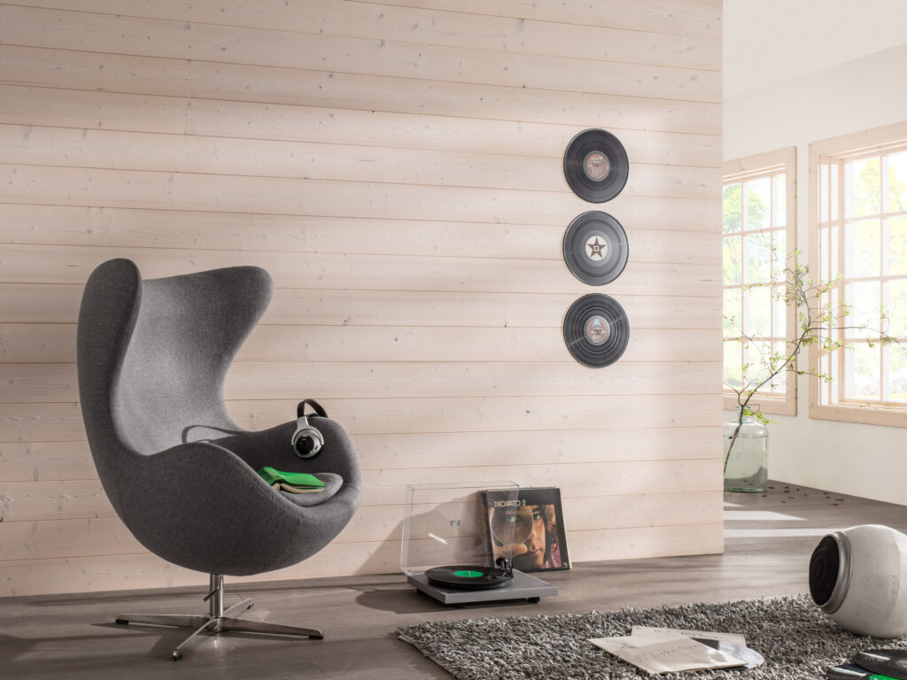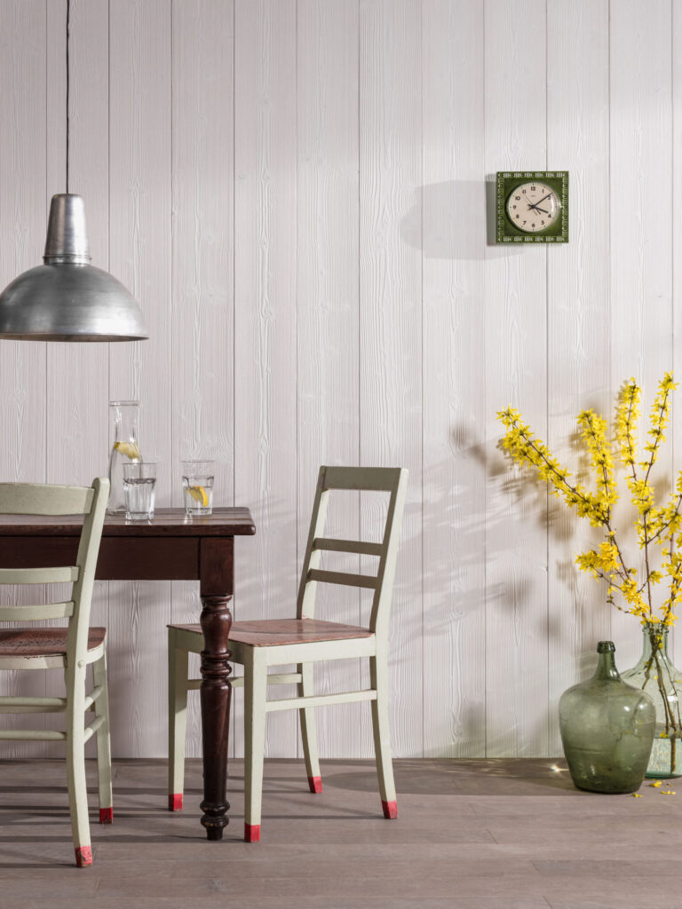 Deski wewnętrzne Carboris Yakisugu można montować w układzie poziomym (zdjęcie po lewej) lub pionowym (zdjęcie po prawej). Na zdjęciu pokazany jest gatunek drewna świerk skandynawski z fabryczną warstwą specjalnego lakieru.