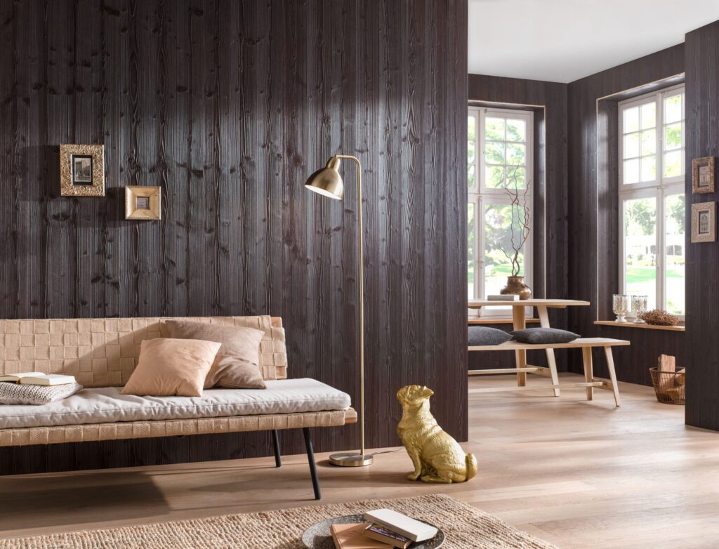 Nowoczesna boazeria wewnętrzna w kolorze czarnym CARBORIS Yakisugi. Drewno opalane ogniem wg tradycyjnej japońskiej metody 焼き杉 Yakisugi (znane także jako Shou Sugi Ban) + fabryczne zabezpieczenie bezbarwnym lakierem dekorującym i chroniącym przed brudzeniem.