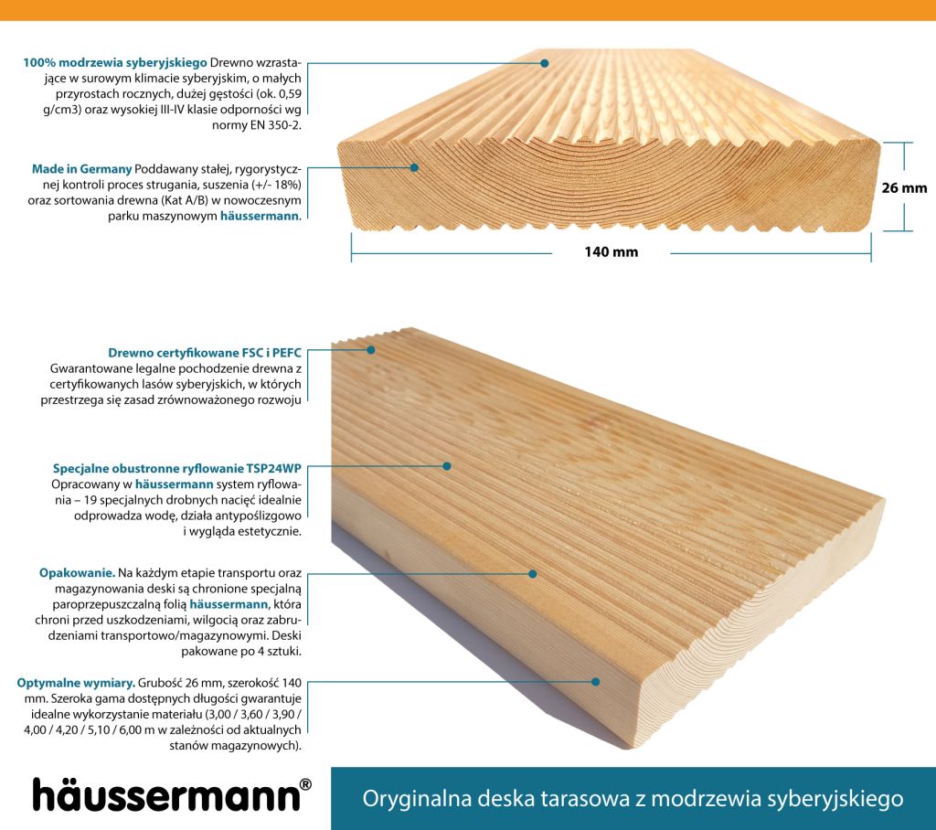 Od wielu lat wśród desek tarasowych bestsellerem jest oryginalna deska tarasowa, ryflowana, z modrzewia syberyjskiego/zachodniego jest produkowana przez firmę MOCOPINUS lub przez firmę HÄUSSERMANN. Deska tarasowa z modrzewia syberyjskiego/zachodniego gwarantuje najlepszy stosunek ceny do jakości, walorów użytkowych oraz przewidywanego okresu użytkowania tarasu z drewna, dlatego od lat jest najczęstszym wyborem Klientów EKODREWNO.